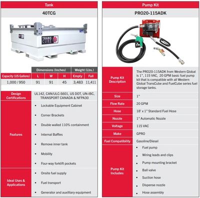 (Nominal / safe fill (95%)) 1,000 / 950 US gal
